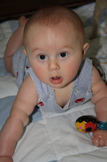 Hudson is a pro at sitting up by himself now. He has been doing this for a couple of weeks now without plopping back down. He is much happier being able to sit up. He can't pull himself up to a sitting position yet, but he will stay there if you put him that way. He is also really trying to crawl. He kind of swims when you put him on his stomach and he can get his arms and head up really high, but the back end is the tough part! It is funny to watch him try though. He really wants to do it, but he's just not ready yet. He started this little army crawl this past weekend so he can scoot a little bit. Our house is not ready for him to be on the move yet so hopefully he will wait on that a little longer!